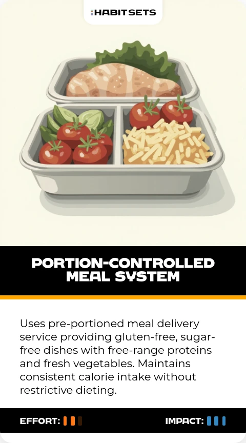 Uses pre-portioned meal delivery service providing gluten-free, sugar-free dishes with free-range proteins and fresh vegetables. Maintains consistent calorie intake without restrictive dieting.