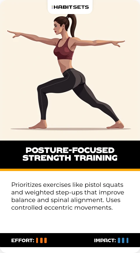Prioritizes exercises like pistol squats and weighted step-ups that improve balance and spinal alignment. Uses controlled eccentric movements.