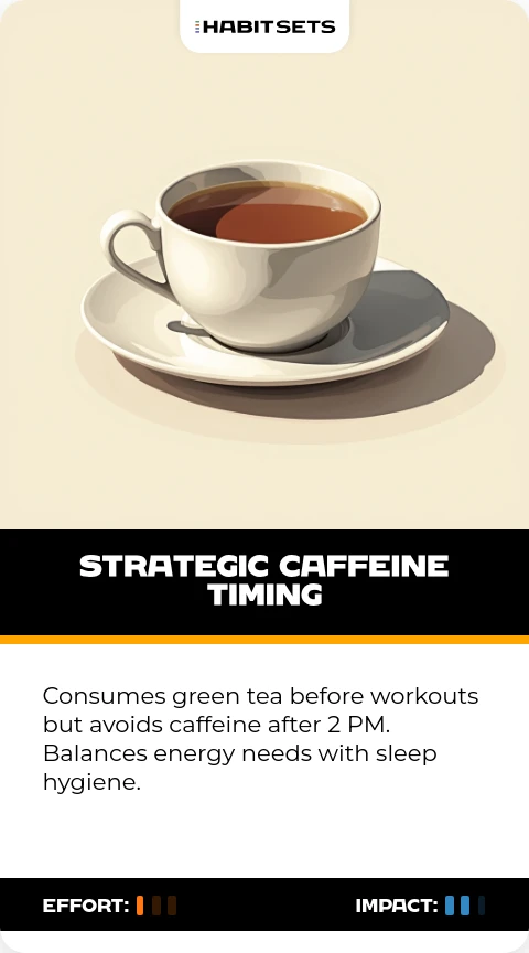 Consumes green tea before workouts but avoids caffeine after 2 PM. Balances energy needs with sleep hygiene.