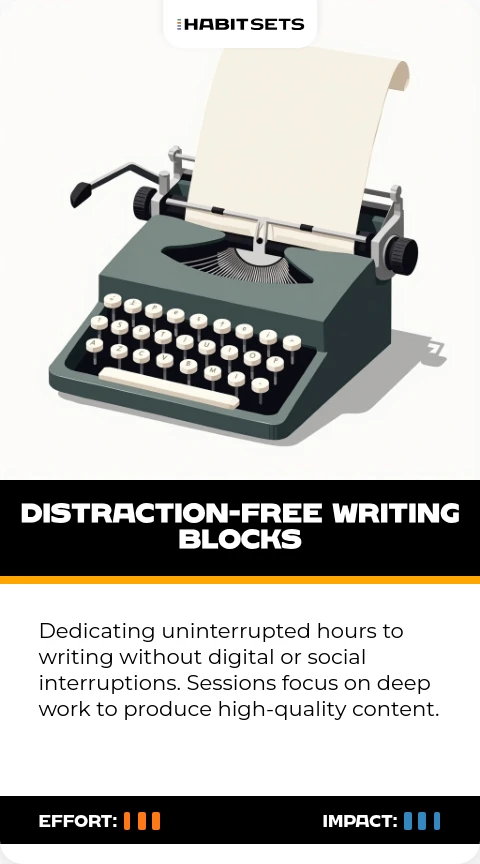 Dedicating uninterrupted hours to writing without digital or social interruptions. Sessions focus on deep work to produce high-quality content.