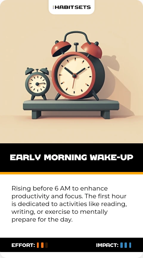 Rising before 6 AM to enhance productivity and focus. The first hour is dedicated to activities like reading, writing, or exercise to mentally prepare for the day.