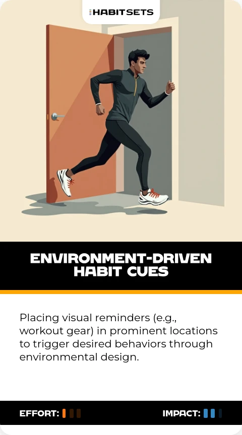 Placing visual reminders (e.g., workout gear) in prominent locations to trigger desired behaviors through environmental design.
