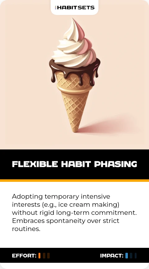 Adopting temporary intensive interests (e.g., ice cream making) without rigid long-term commitment. Embraces spontaneity over strict routines.
