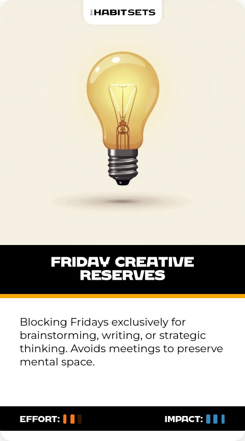 Blocking Fridays exclusively for brainstorming, writing, or strategic thinking. Avoids meetings to preserve mental space.
