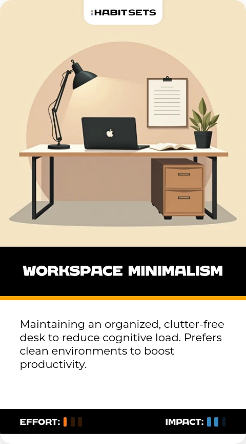 Maintaining an organized, clutter-free desk to reduce cognitive load. Prefers clean environments to boost productivity.