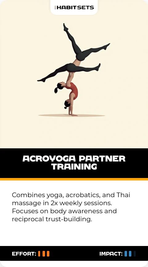 Combines yoga, acrobatics, and Thai massage in 2x weekly sessions. Focuses on body awareness and reciprocal trust-building.