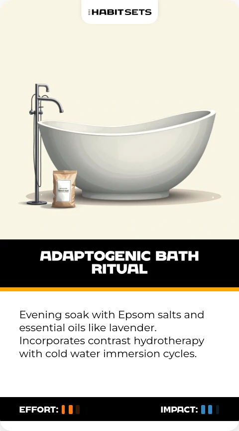 Evening soak with Epsom salts and essential oils like lavender. Incorporates contrast hydrotherapy with cold water immersion cycles.