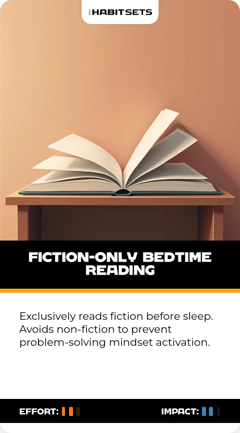Exclusively reads fiction before sleep. Avoids non-fiction to prevent problem-solving mindset activation.