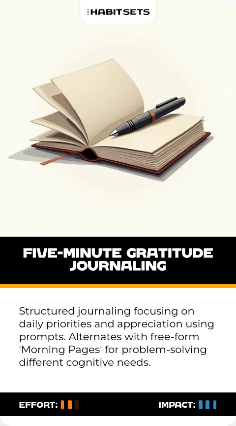 Structured journaling focusing on daily priorities and appreciation using prompts. Alternates with free-form 'Morning Pages' for problem-solving different cognitive needs.