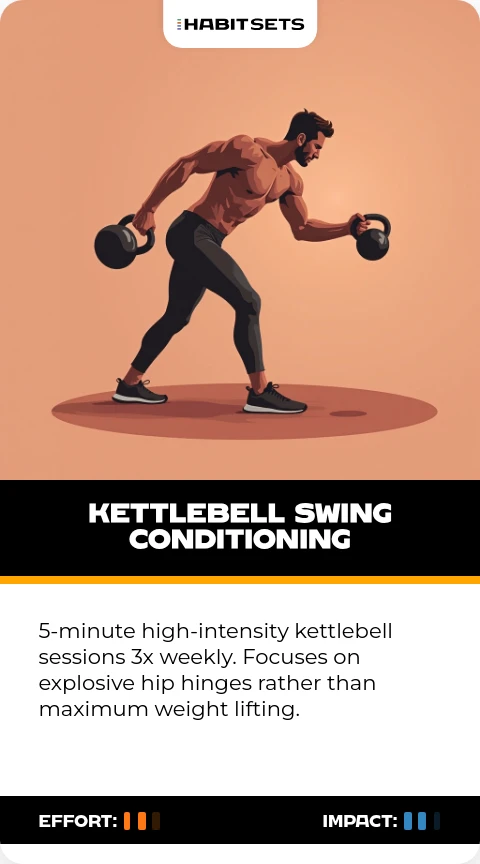 5-minute high-intensity kettlebell sessions 3x weekly. Focuses on explosive hip hinges rather than maximum weight lifting.