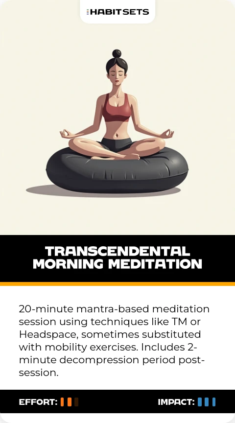 20-minute mantra-based meditation session using techniques like TM or Headspace, sometimes substituted with mobility exercises. Includes 2-minute decompression period post-session.