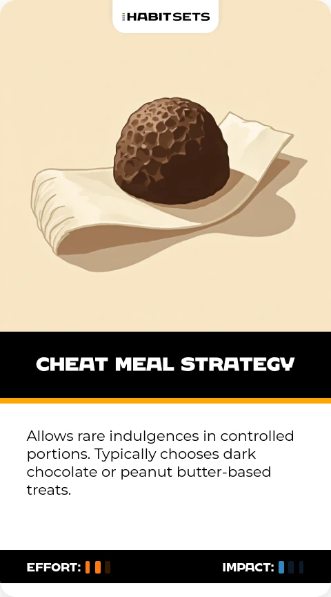 Allows rare indulgences in controlled portions. Typically chooses dark chocolate or peanut butter-based treats.