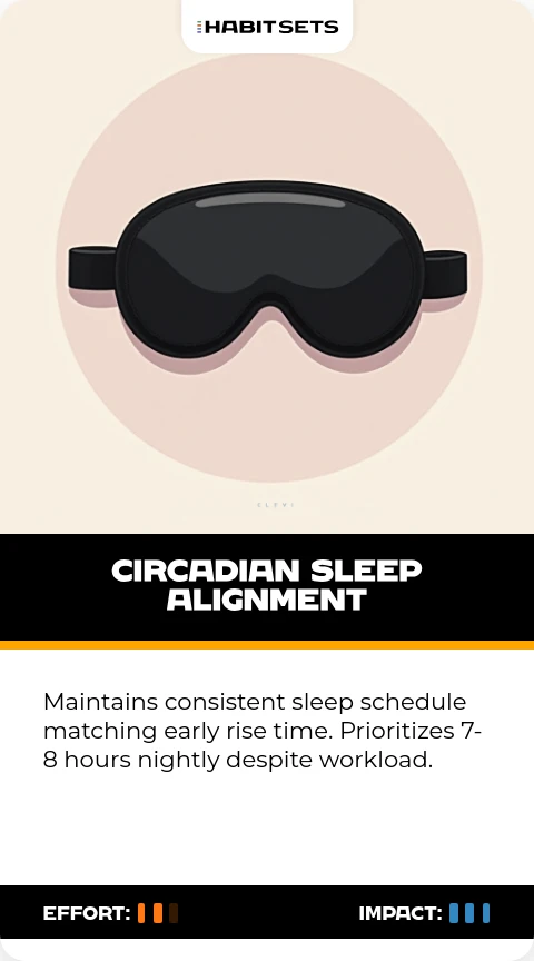 Maintains consistent sleep schedule matching early rise time. Prioritizes 7-8 hours nightly despite workload.