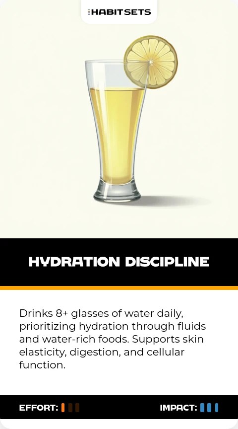 Drinks 8+ glasses of water daily, prioritizing hydration through fluids and water-rich foods. Supports skin elasticity, digestion, and cellular function.