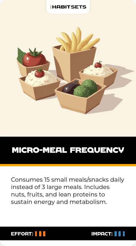 Consumes 15 small meals/snacks daily instead of 3 large meals. Includes nuts, fruits, and lean proteins to sustain energy and metabolism.