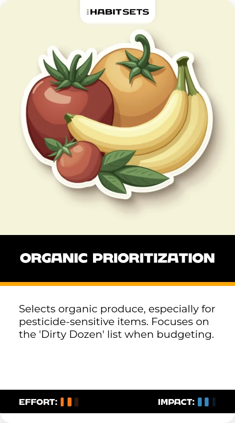 Selects organic produce, especially for pesticide-sensitive items. Focuses on the 'Dirty Dozen' list when budgeting.