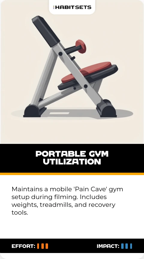 Maintains a mobile 'Pain Cave' gym setup during filming. Includes weights, treadmills, and recovery tools.