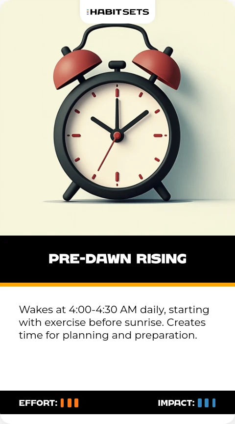 Wakes at 4:00-4:30 AM daily, starting with exercise before sunrise. Creates time for planning and preparation.