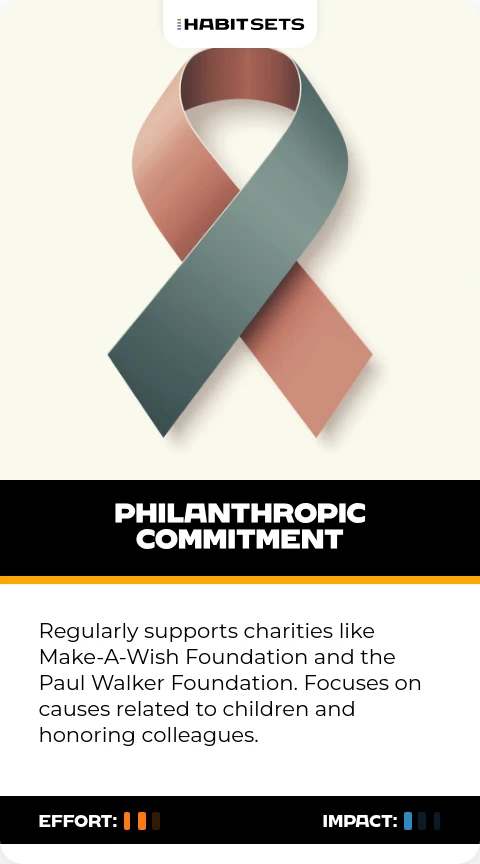 Regularly supports charities like Make-A-Wish Foundation and the Paul Walker Foundation. Focuses on causes related to children and honoring colleagues.