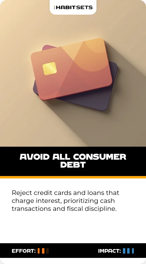 - Debt Avoidance: Avoid all consumer debt to prevent wealth erosion through interest payments and maintain financial freedom for strategic investments.