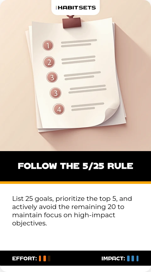 - Focused Prioritization: Apply the 5/25 rule to ruthlessly focus on your top priorities and eliminate distractions from less important goals, maximizing impact.