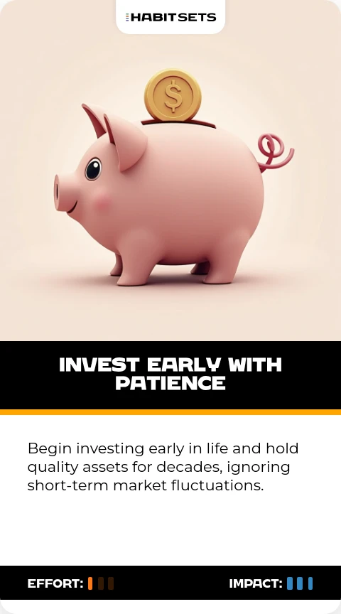 Begin investing early in life and hold quality assets for decades, ignoring short-term market fluctuations.