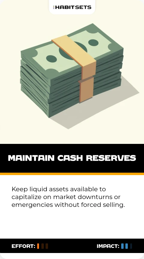Keep liquid assets available to capitalize on market downturns or emergencies without forced selling.