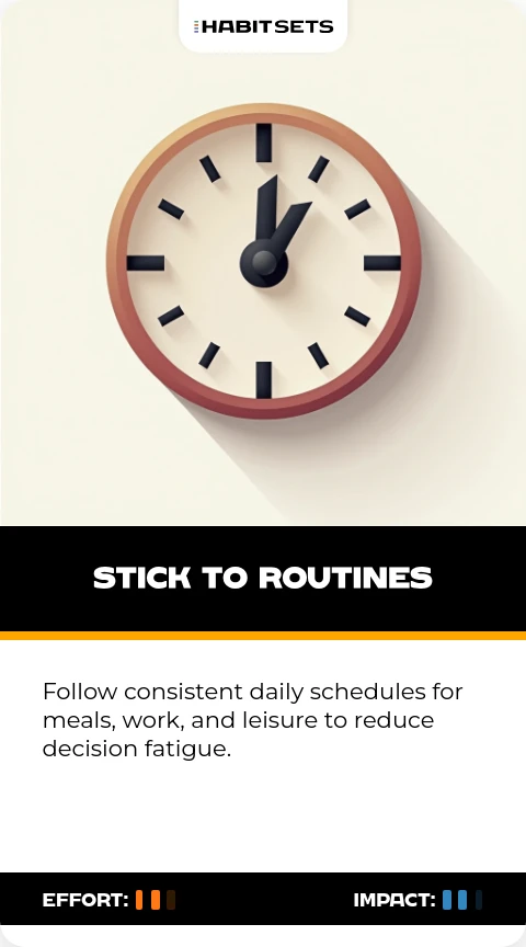 Follow consistent daily schedules for meals, work, and leisure to reduce decision fatigue.