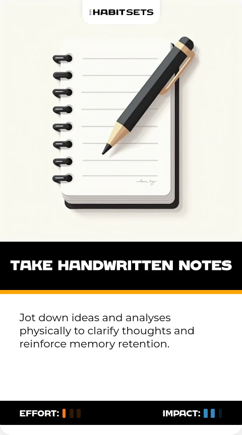 Jot down ideas and analyses physically to clarify thoughts and reinforce memory retention.