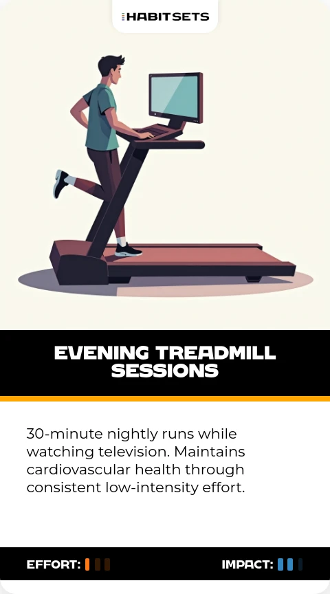 30-minute nightly runs while watching television. Maintains cardiovascular health through consistent low-intensity effort.