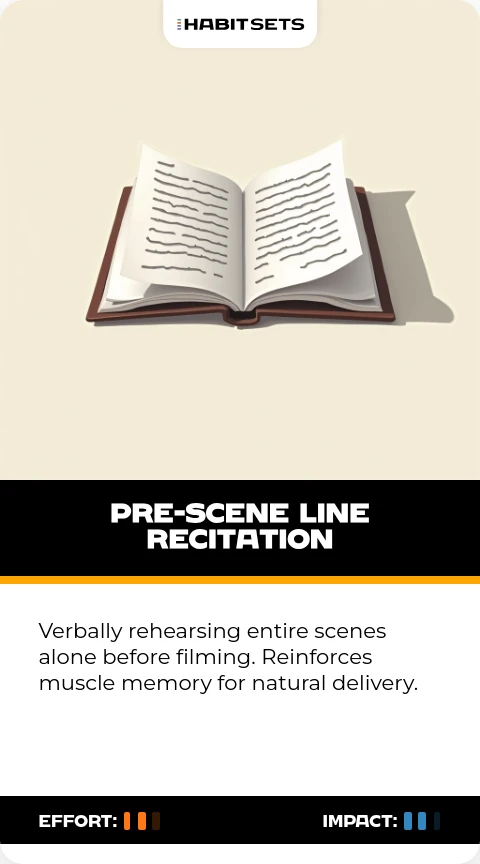 Verbally rehearsing entire scenes alone before filming. Reinforces muscle memory for natural delivery.