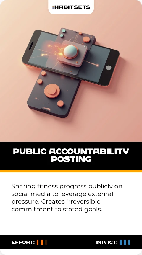 Sharing fitness progress publicly on social media to leverage external pressure. Creates irreversible commitment to stated goals.